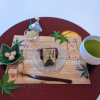 初夏のおもてなし 2022.05.14 スタッフ日誌 エスプリ・ド・マミ 大阪府枚方市。 インテリア書道のアトリエでのイベントにお邪魔いたしました。 越智先生と生徒さんの作品をインテリアとして飾ってあり、どれも素敵でした。 作品を際立たせるコツなどのお話を聞いた後は、おいしいお菓子とお茶をいただきました。 薄い木の敷物には手書きで季節に合った百人一首の句が書かれています。 青紅葉がさわやかですね。