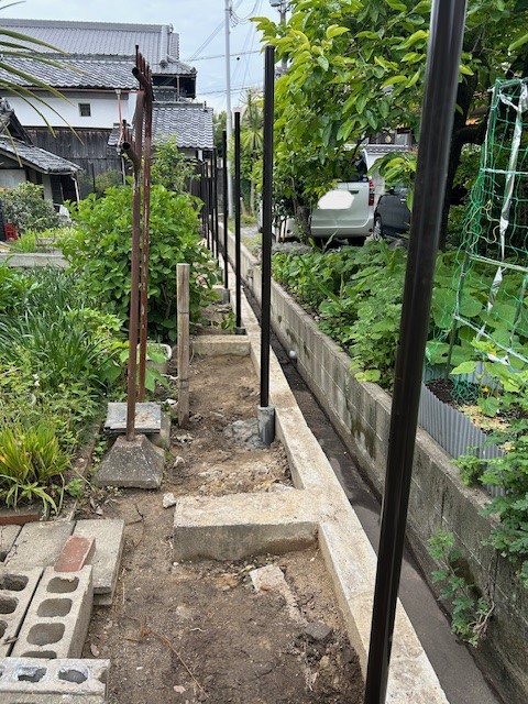 完 土塀からフェンスへ 2024.05.21 スタッフ日誌 火曜です。河内です。 沖縄は梅雨入り間近らしい。 ジメジメの季節がやってきます嫌な季節です。 画像は先週の続きです。 フェンス支柱用のベース穴をあけて鉄管を埋めます。 そして支柱を立ててモルタルを流して固め。 フェンスを取付けて完了! お施主様にも大変喜んでいただき良かったです。 これで倒壊の心配もなくなりました。 内装リフォームはお気軽にお問い合わせください。 内装以外の工事もお気軽にお問い合わせください。 それでは今週も張り切って行きましょう