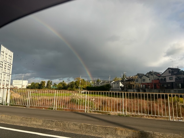 晴れ間に虹 2023.11.14 スタッフ日誌 火曜です。河内です。 先週末から一気に冬らしい気温になりました。 風邪には十分気を付けましょう 昨日の天気は雨勝ちで寒かったですが 晴れ間に虹が見えました 何か良い事があるでしょう それでは今週も張り切って行きましょう