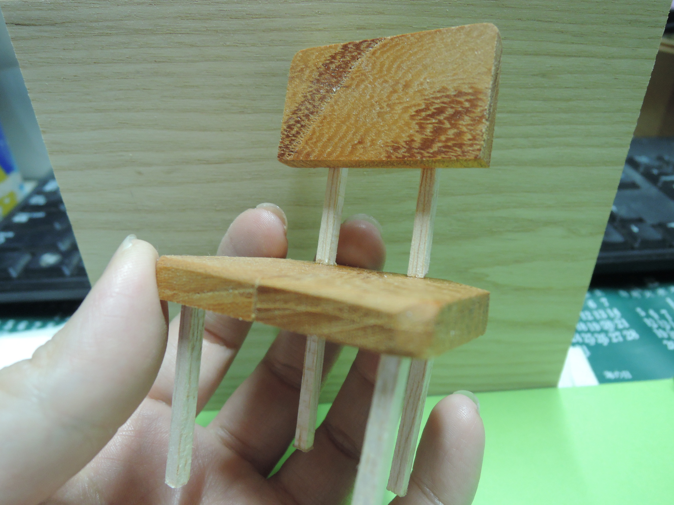 ドールハウスのいす 2016.11.27 木材のこと ドールハウスに使えるフローリングの撮影用に1/12の椅子を作ってみました 座面と背もたれがケヤキでできた贅沢な椅子です せっかくフローリングがナラ、ブラックウォールナット、チェリーといった いいものでできているのですから、それに見合った椅子にしました しかし、デザインが悪かったですね いかにも模型って感じです ドールハウスは奥が深そうです