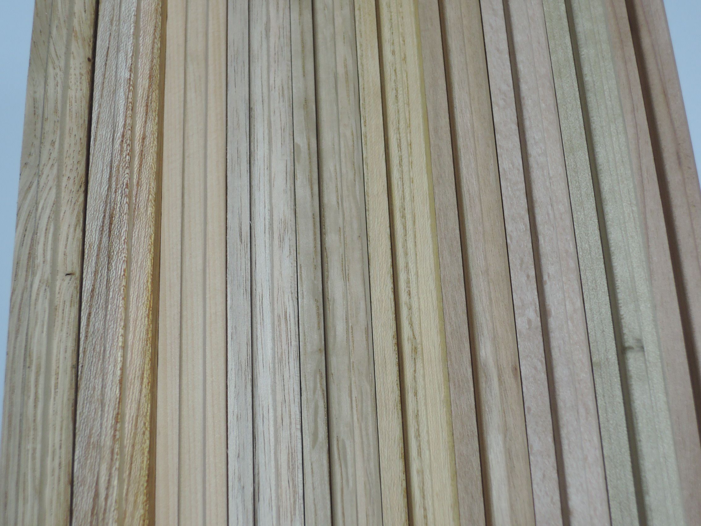 国産フローリングサンプルいろいろ 2016.12.18 木材のこと 国産フローリングのサンプルをいろいろ並べて横からみたところです それぞれの色が違うのでパステル色のきれいな縞模様になりました 名前わかりますか?