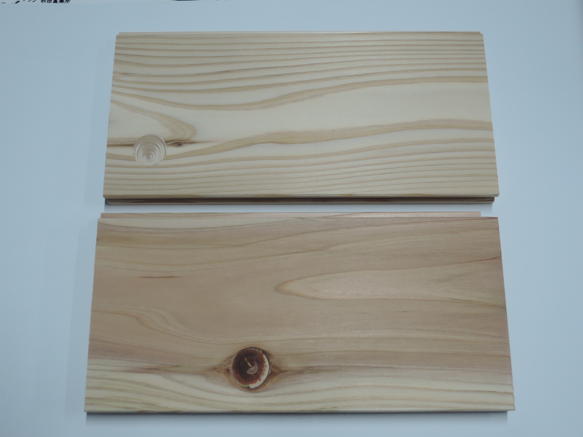 写真にある2枚のフローリングサンプルはどちらも同じ徳島杉です