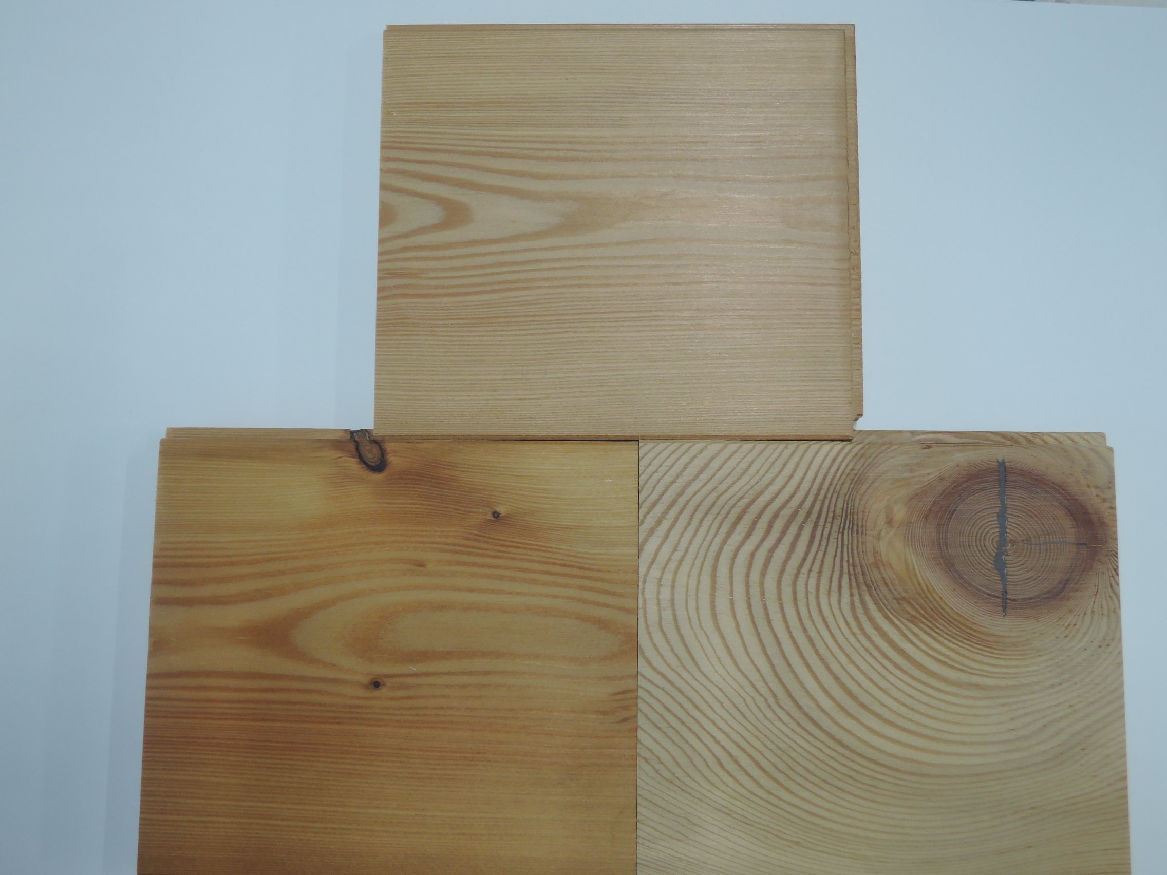 写真にある3枚のフローリングサンプルはどれも同じ 唐松 ラーチ です