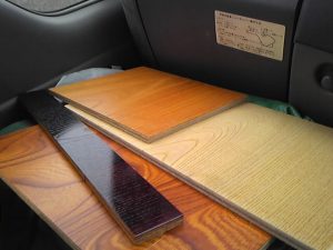 ケアキ地板の色見本のサンプルを助手席に積みこみ
