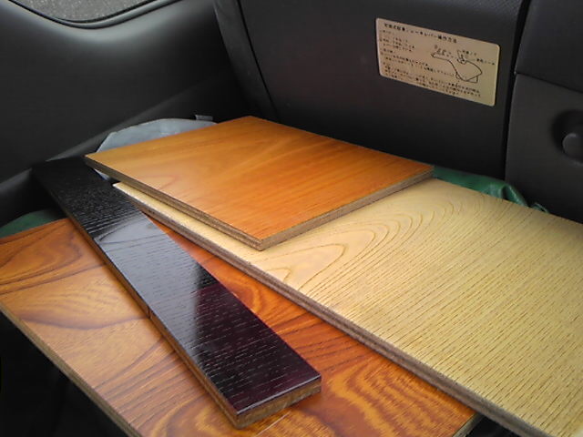 ケアキ地板の色見本のサンプルを助手席に積みこみ