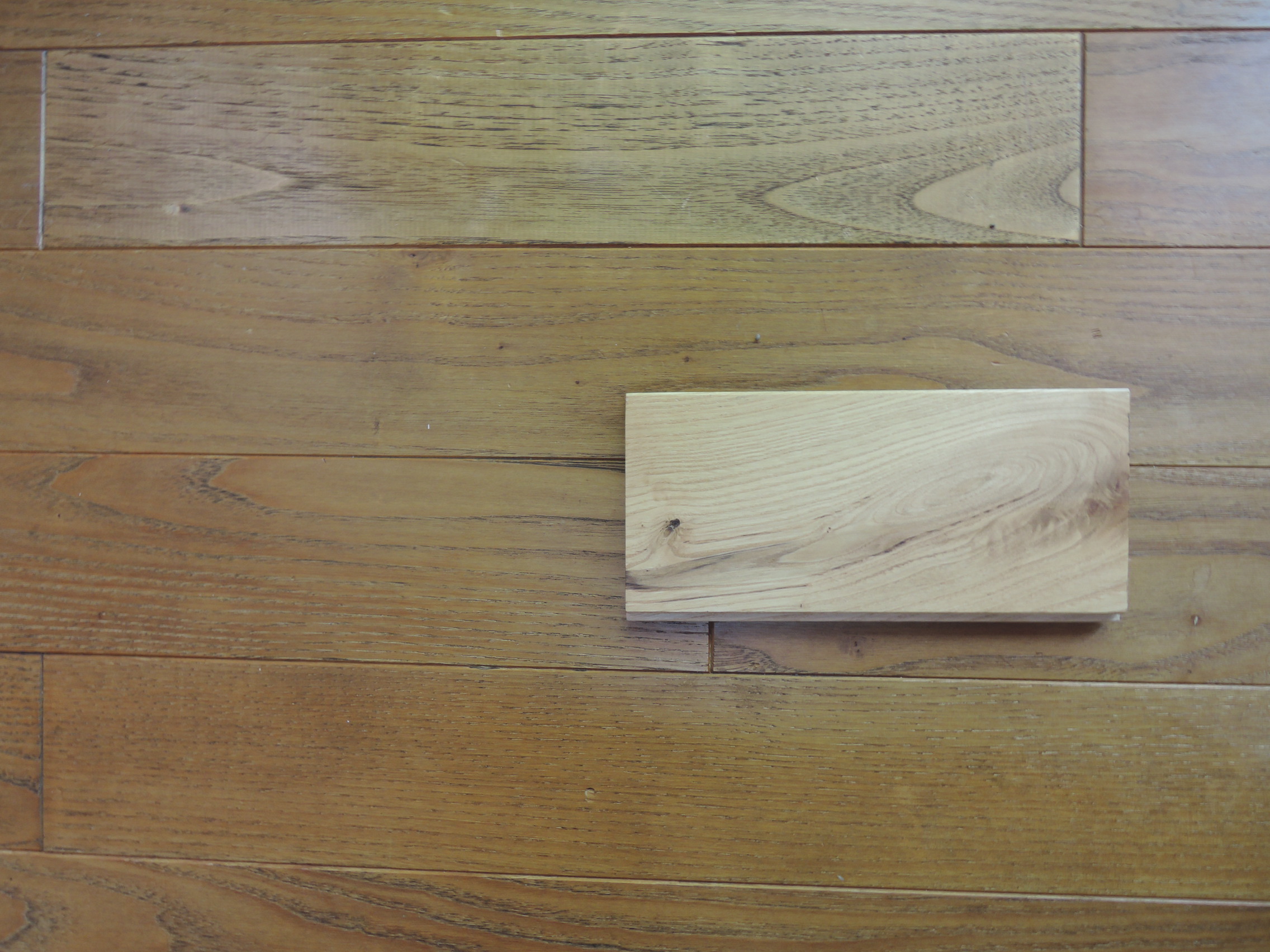写真は10年以上経った栗フローリングの床に、新しいサンプルを置いたものです