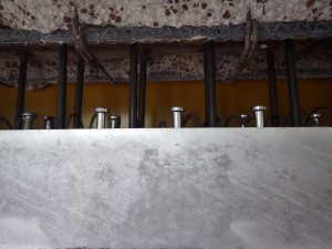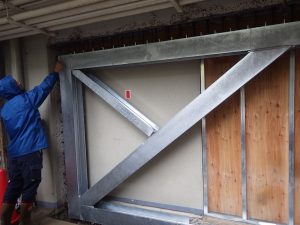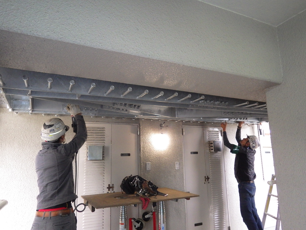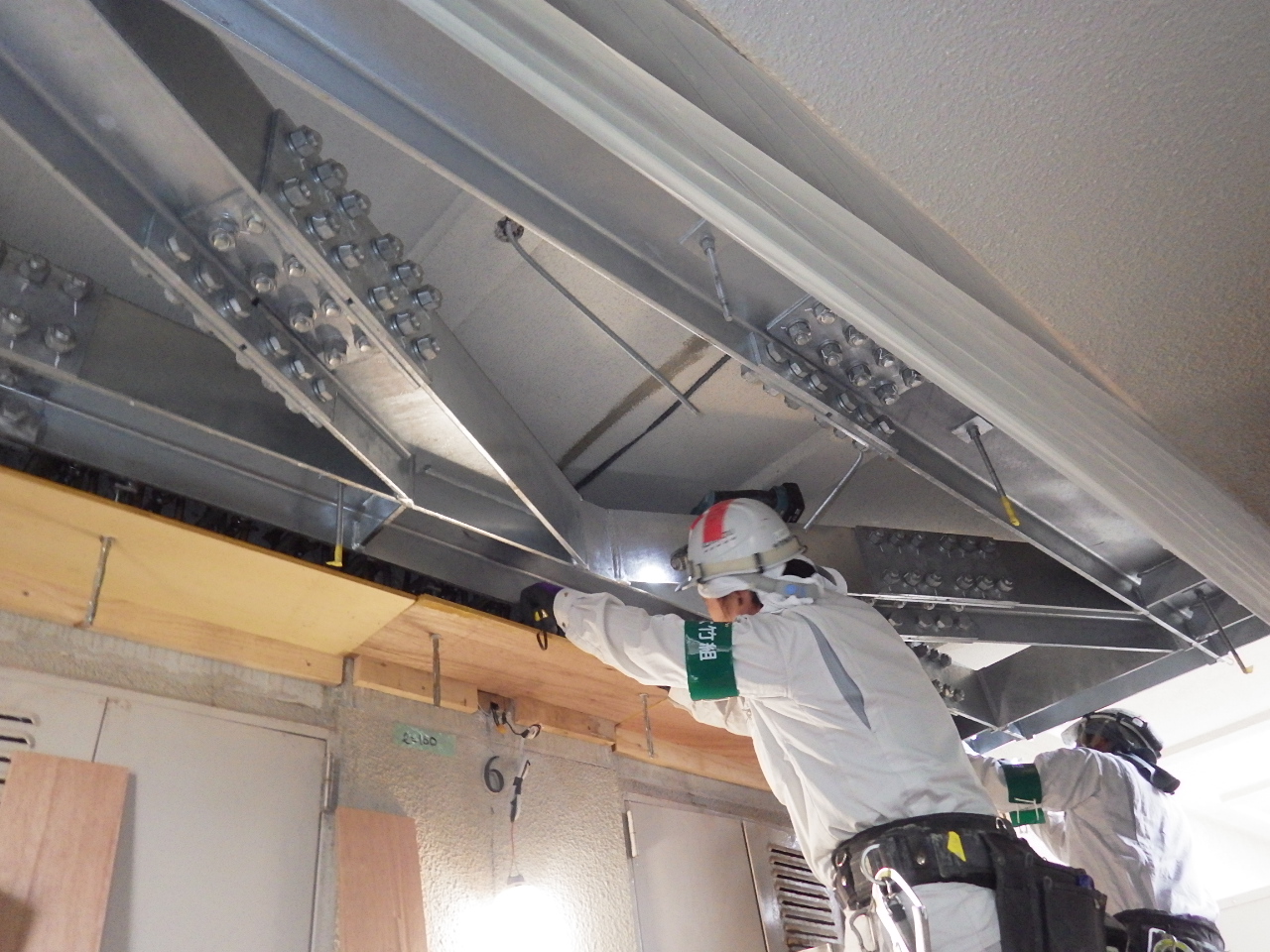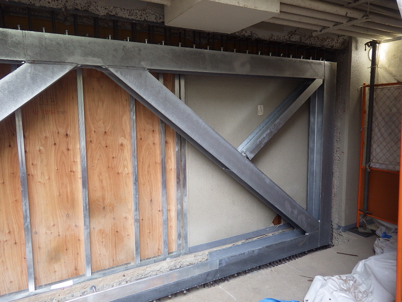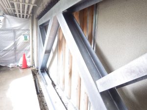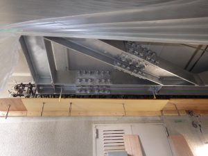 耐震補強② 2017.10.20 金曜日担当の木下です。おはようございます。 先週ご紹介した耐震補強の鉄骨材を取り付け作業にかかりました。 大変な重量物なので大変な作業でしたが、事故もなく取り付けられれました。 職人の方々、警備員の方々 感謝します。