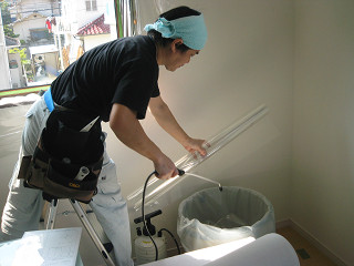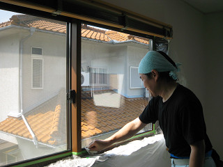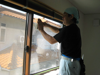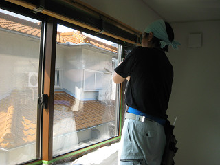 これが、防犯フィルムです。予め打ち合わせの段階で寸法を取っておき、工場でプレカット(サイズに合わせて作っておく)したものを貼っていきます。(職人さんによっては現地で防犯フィルムをカットする方もいらっしゃいます)