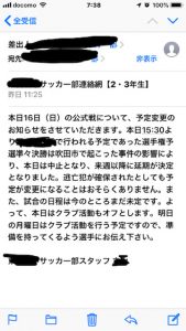 安全な場所は無いのかも 2019.06.20 スタッフ日誌 木曜です。河内です。 ビックリですね 日曜の早朝に警察官が刺されて拳銃を奪われた事件です。 G20も間近にひかえての事件でしたもんね。 警察も必死のパッチで探した事でしょう。 ご苦労さまです。 そんな影響が枚方市の中学サッカー部の試合にもありました。 息子の応援に行く気満々でしたが・残念 でも安全第一ですもんね。 画像は中学校からのメールです。 次戦に向けてガンバって欲しいです。 それでは今週も必死のパッチで張り切って行きましょう
