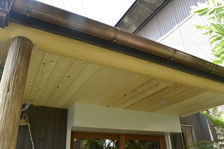 ショールームの軒を工事して、軒天を無垢羽目板にしました
