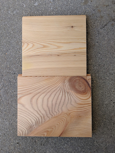 今日のサンプル 唐松 2019.09.07 木材のこと サンプル担当より、エンドユーザーの皆様が疑問に思っているだろう木材の用語や特徴などを 少しでも理解して、木材に親しんでもらえたらな~ というわけで今日は 唐松フローリング を紹介いたします 上が小節 下が節あり 節ありはこれでもか!という部分です こんに仲良く近寄った節は珍しいですね 唐松は木目がはっきりしてますし、節が大きくて多いです 木目の渦の中に節があるのですごく目立ちます その分変化にとんだ模様をして楽しませてくれます