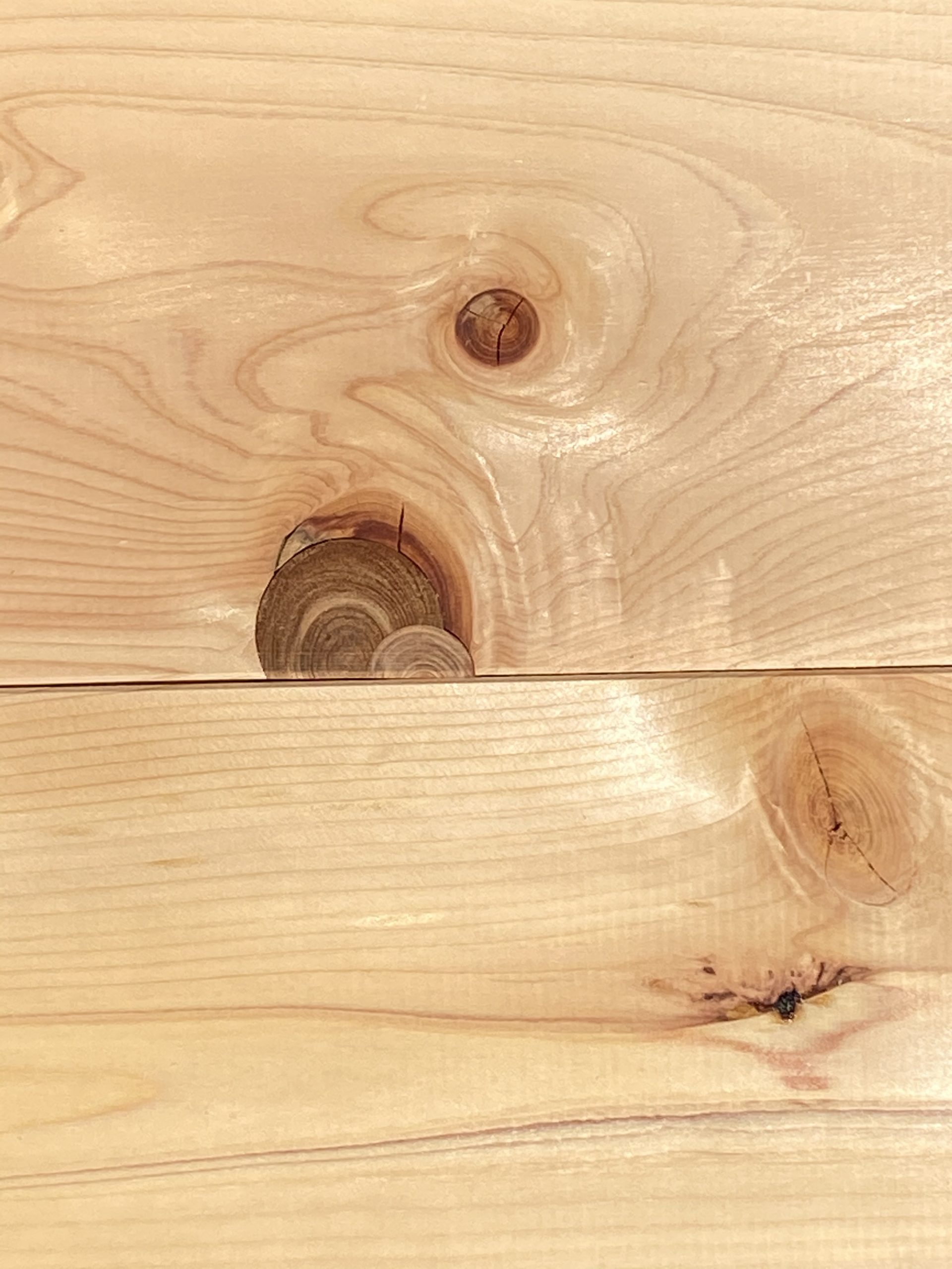 今日のサンプル サワラ 2020.08.08 木材のこと 木曽サワラ羽目板の節ありです 埋木の中にさらに埋木が入った、なんとも芸の細かいものになっています サワラはひのきに比べて柔らかい感触の気がします 色は黄色寄りです
