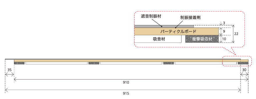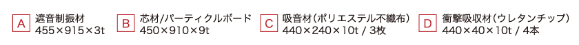 制振ゴムを使用。比重が2.3と重く(質量測の法則)、透過音防止(空気伝幡音)とゴム自体の性質に振動を抑止する効果を合せ(振動=音)、上下階の透過音損失系数を高めています。