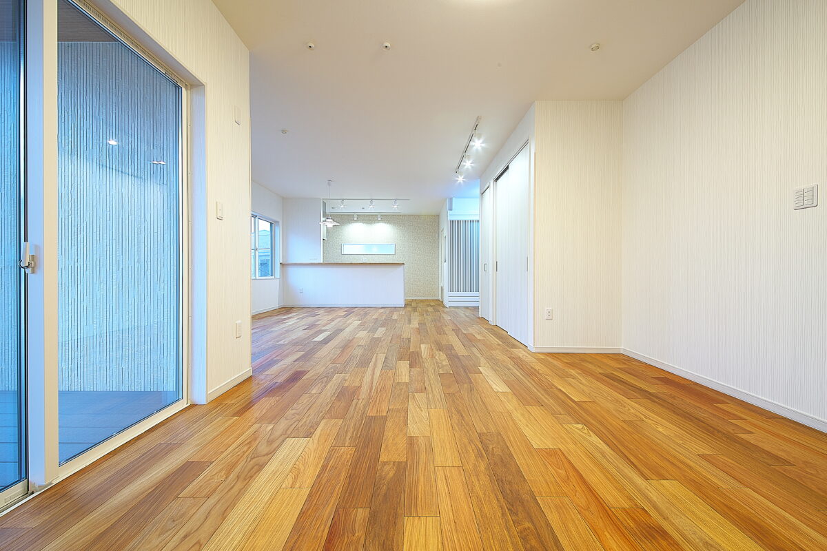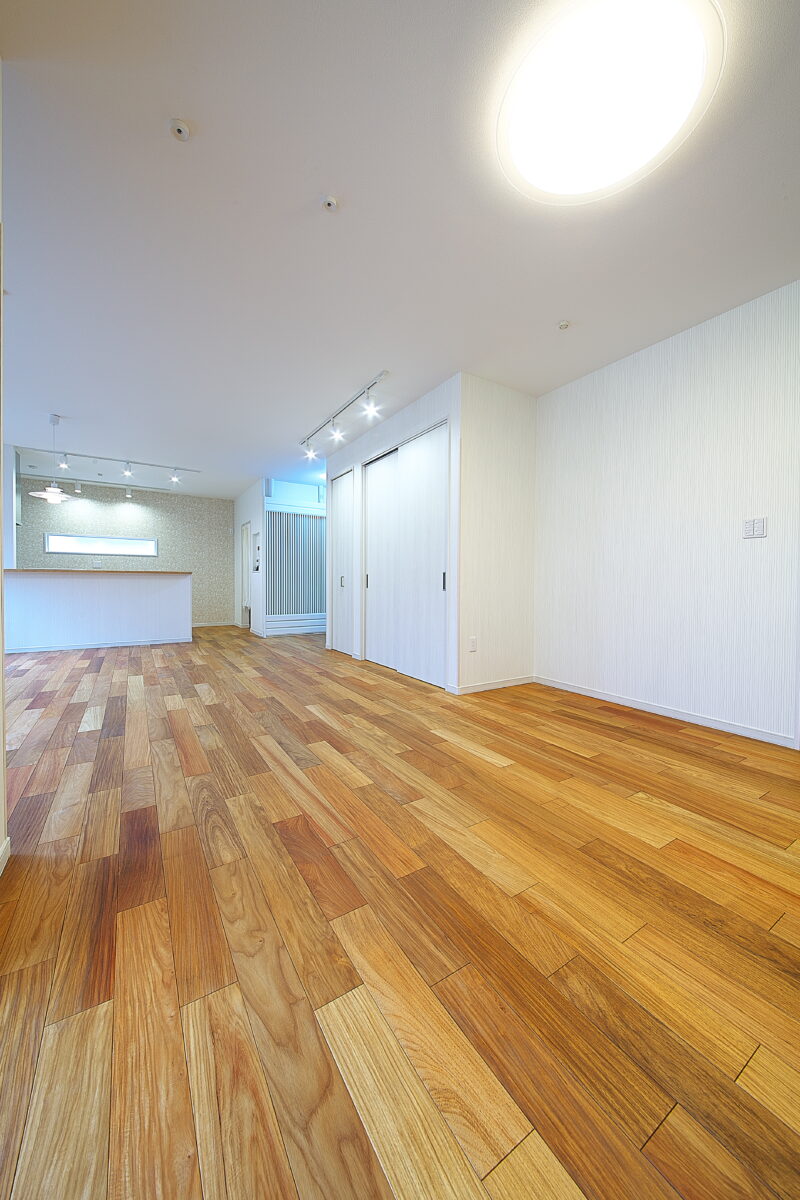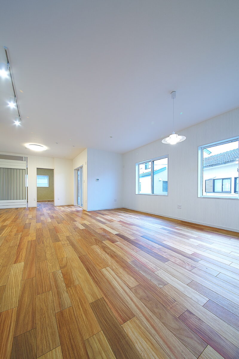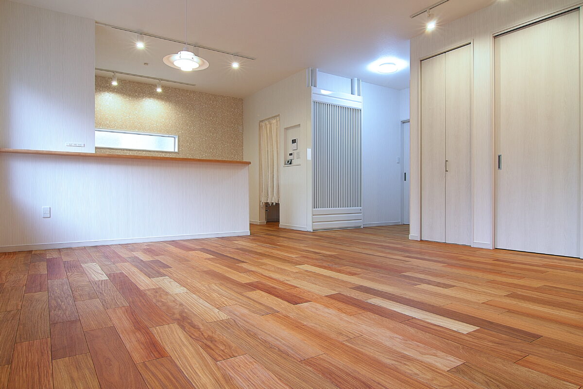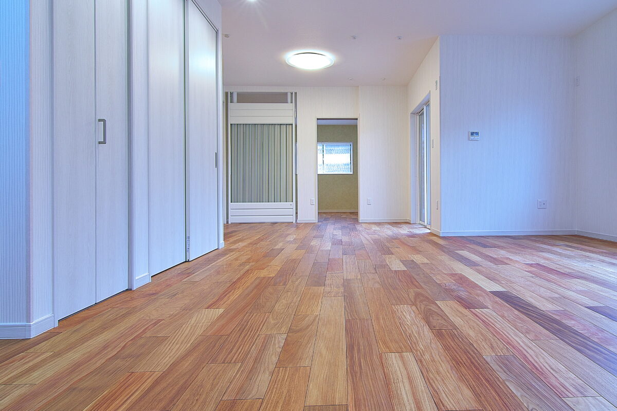 大阪府 Y様邸 戸建新築幅広120mm・乱尺 無垢フローリング施工事例〔No.1〕 リンゴア/ネシア花梨 幅広120mm・無塗装・乱尺 無塗装(品番:LG0005) 別途蜜ロウワックス塗装 特注・上框(集成単板貼)蜜ロウワックス塗装