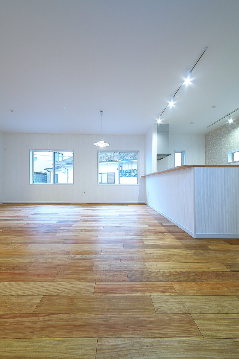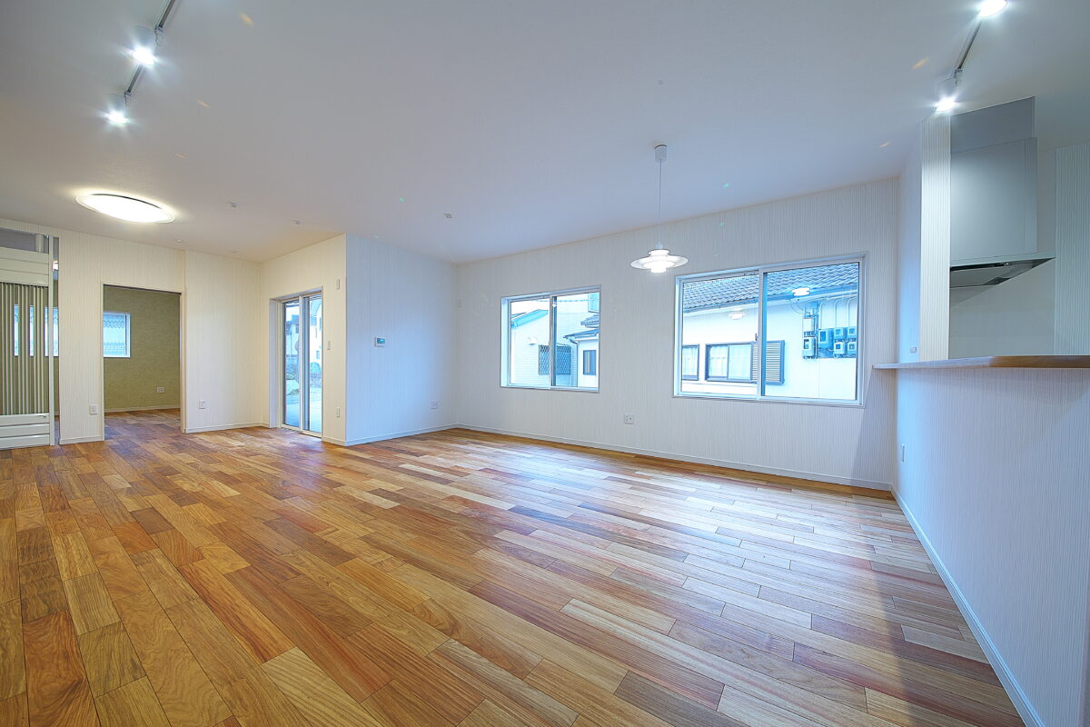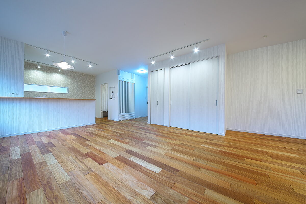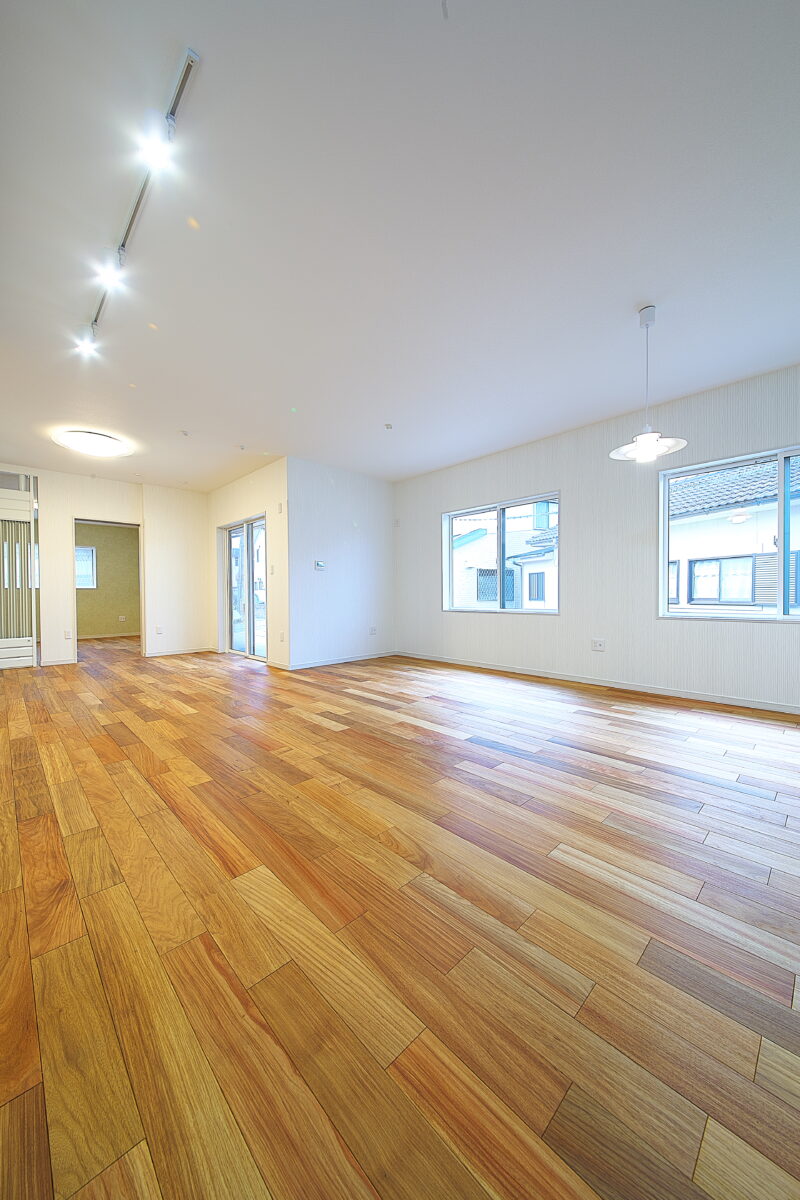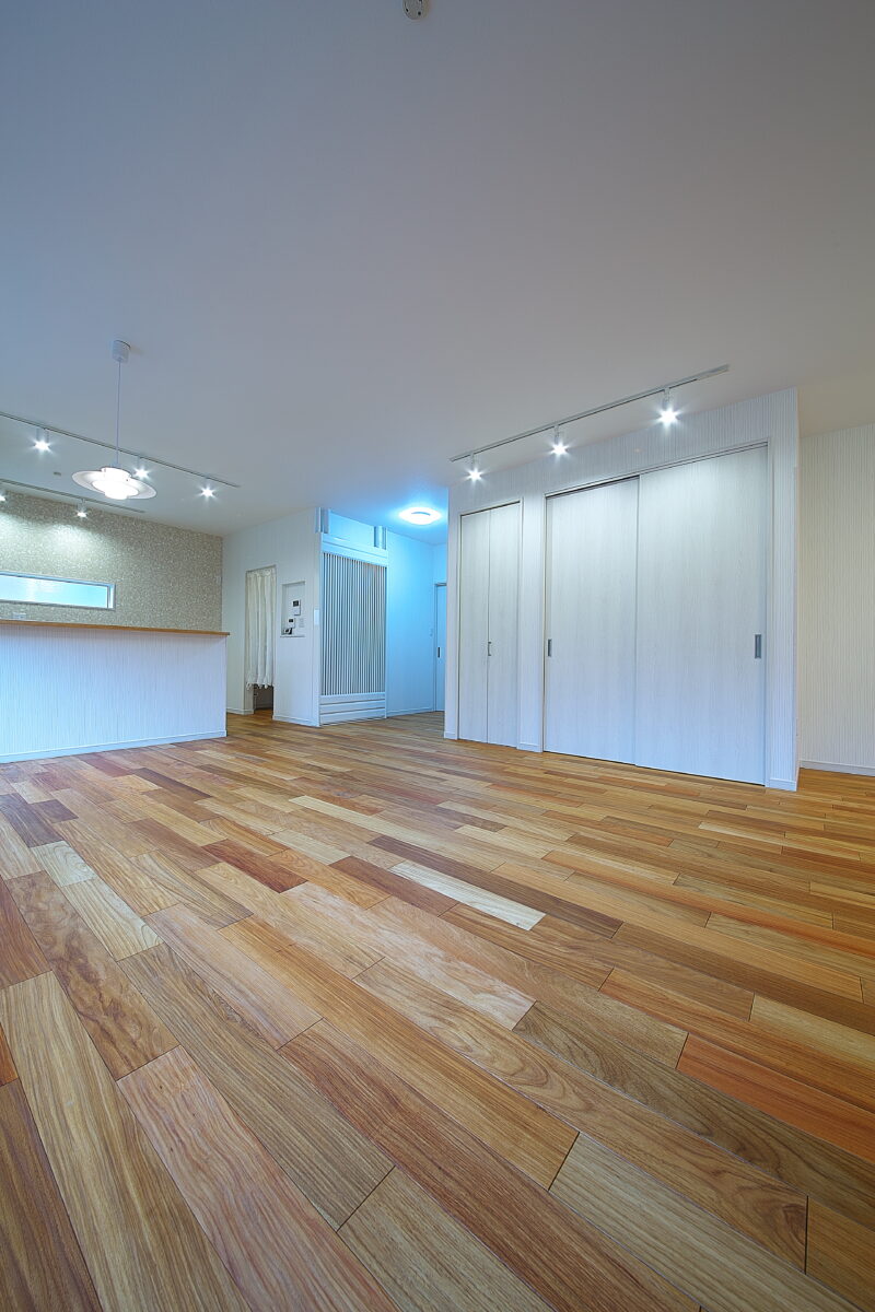 大阪府 Y様邸 戸建新築幅広120mm・乱尺 無垢フローリング施工事例〔No.1〕 リンゴア/ネシア花梨 幅広120mm・無塗装・乱尺 無塗装(品番:LG0005) 別途蜜ロウワックス塗装 特注・上框(集成単板貼)蜜ロウワックス塗装