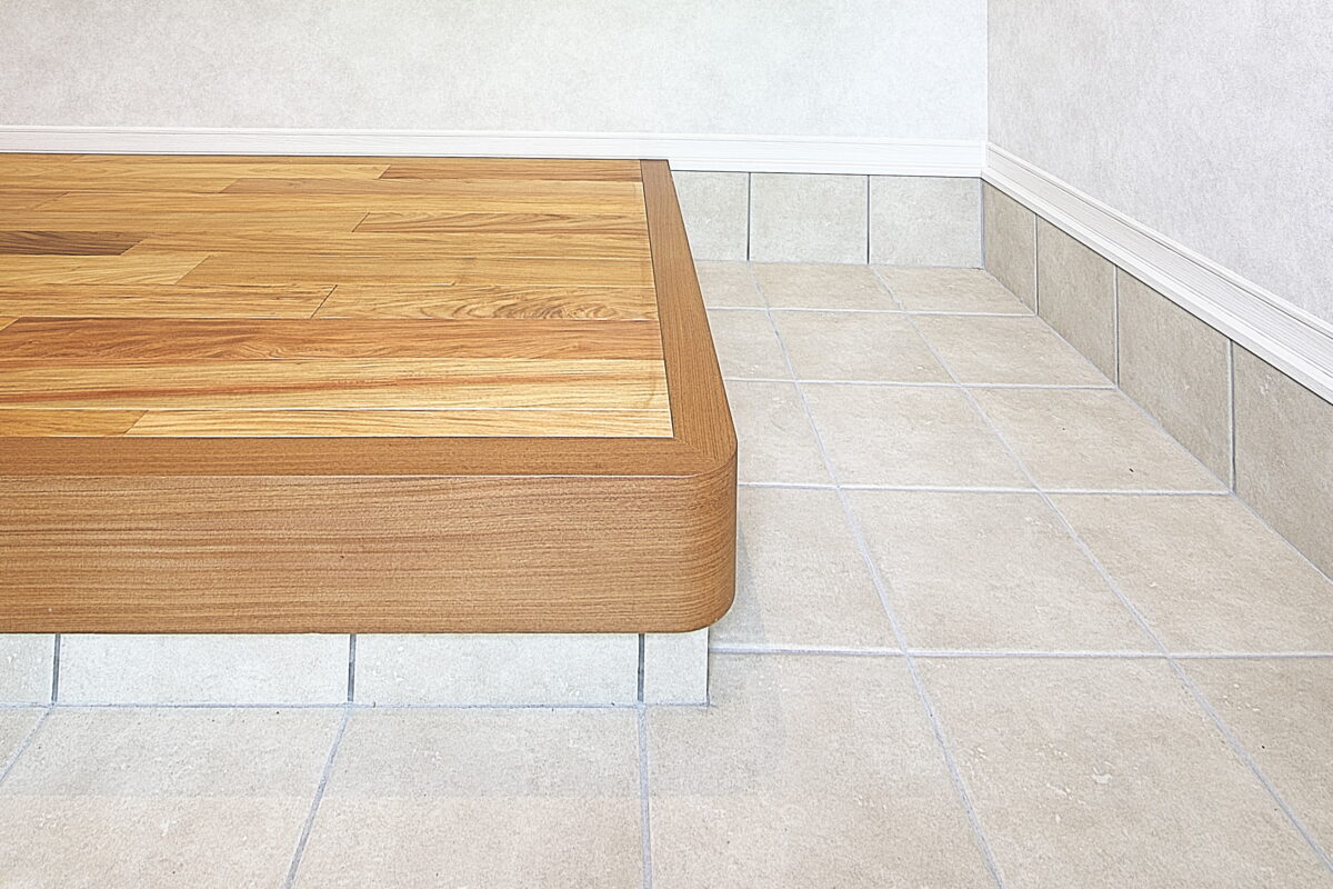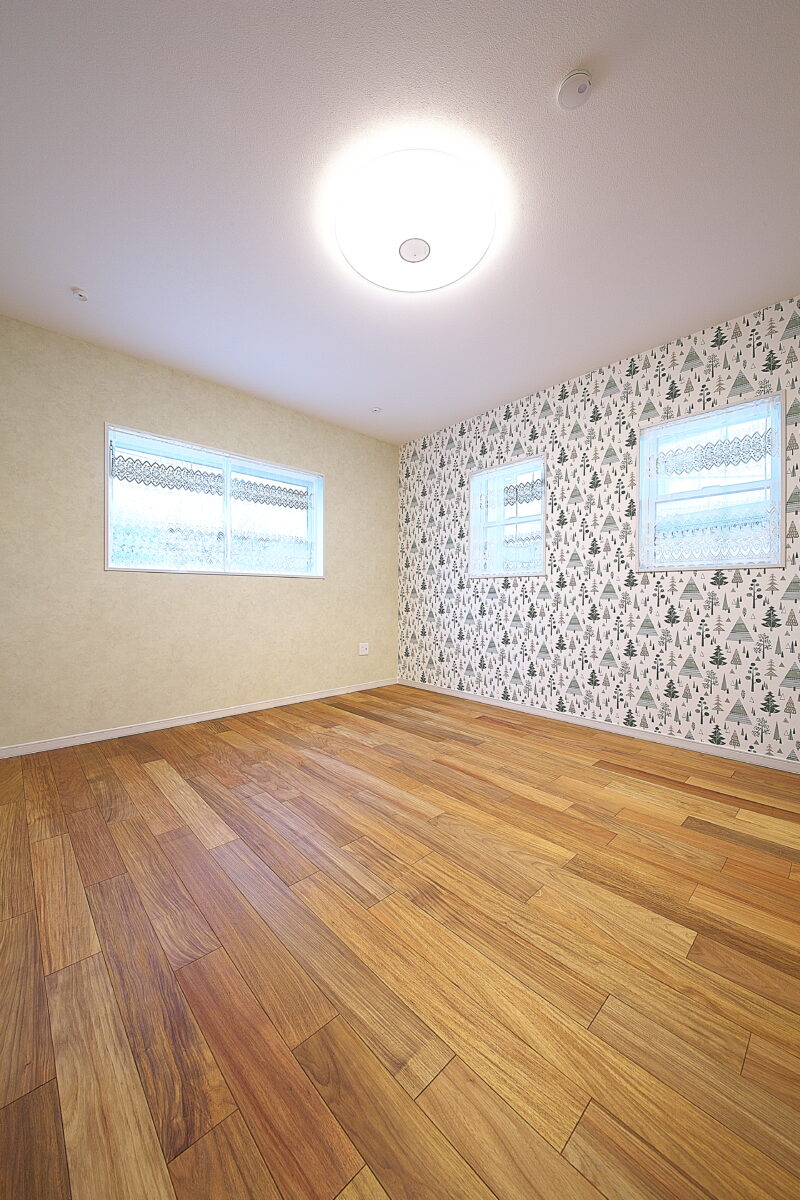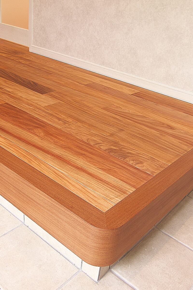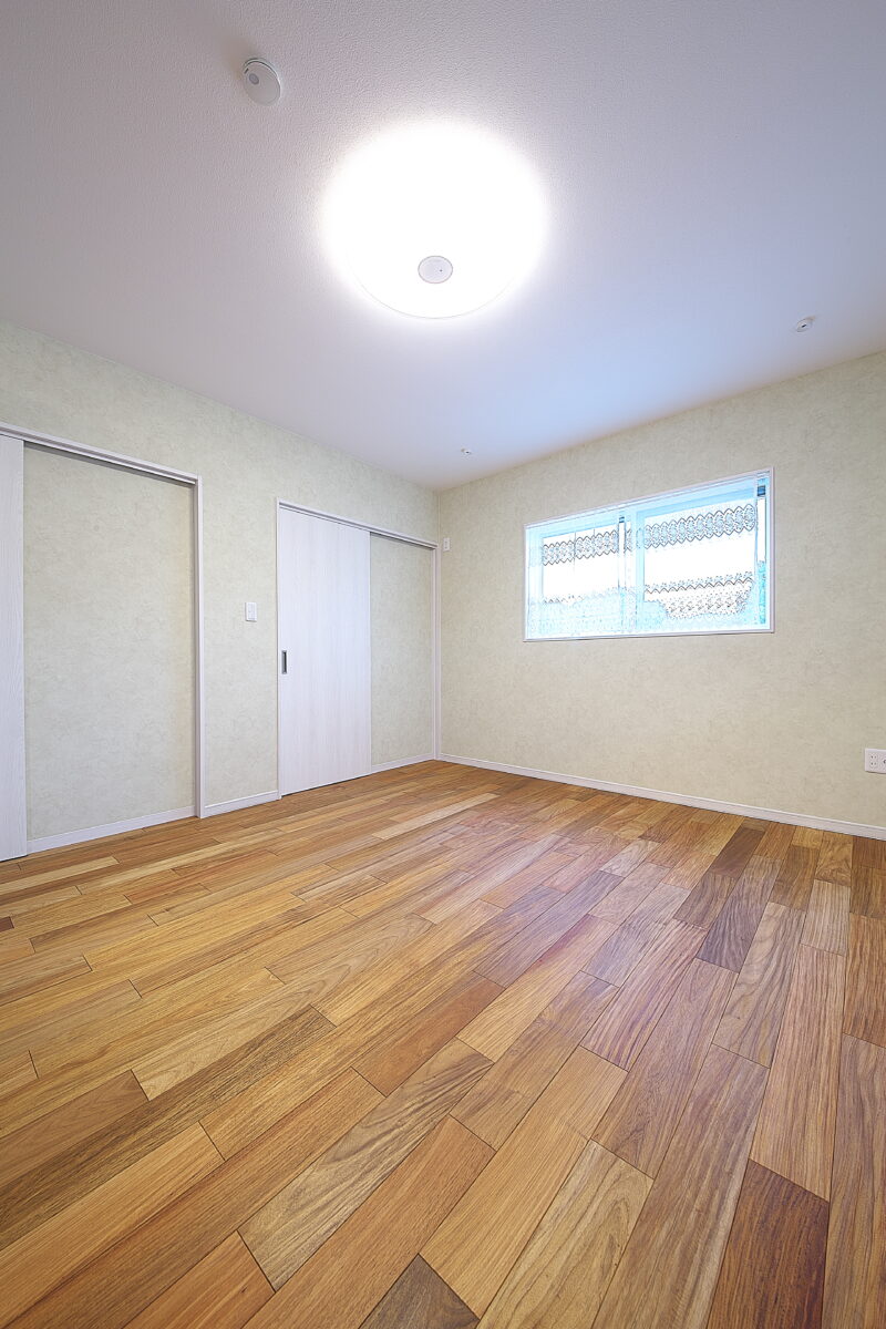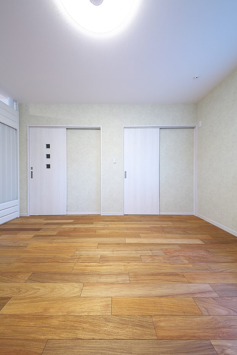 大阪府 Y様邸 戸建新築幅広120mm・乱尺 無垢フローリング施工事例〔No.1〕 リンゴア/ネシア花梨 幅広120mm・無塗装・乱尺 無塗装(品番:LG0005) 別途蜜ロウワックス塗装 特注・上框(集成単板貼)蜜ロウワックス塗装